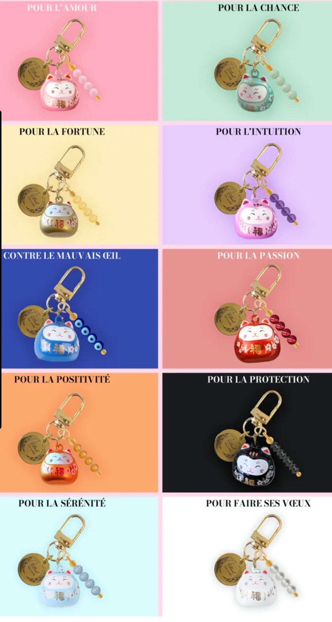 Traditionnellement, on retrouve le Maneki Neko dans les magasins, les restaurants et les maisons, où il est censé attirer la richesse et la chance. Chez Rituel De Lune, nous vous proposons ce petit chat à accrocher partout. Selon la légende, un samouraï aurait été sauvé par un chat qui lui a fait signe de venir, ce qui a conduit à une série d'événements heureux.